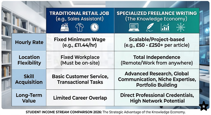 Historically, students worked “blue-collar” jobs to get through university. While these roles taught discipline, they rarely contributed to a student’s professional portfolio. Today, the “Knowledge Economy” allows students to monetize exactly what they are already doing: researching, synthesizing information, and writing.